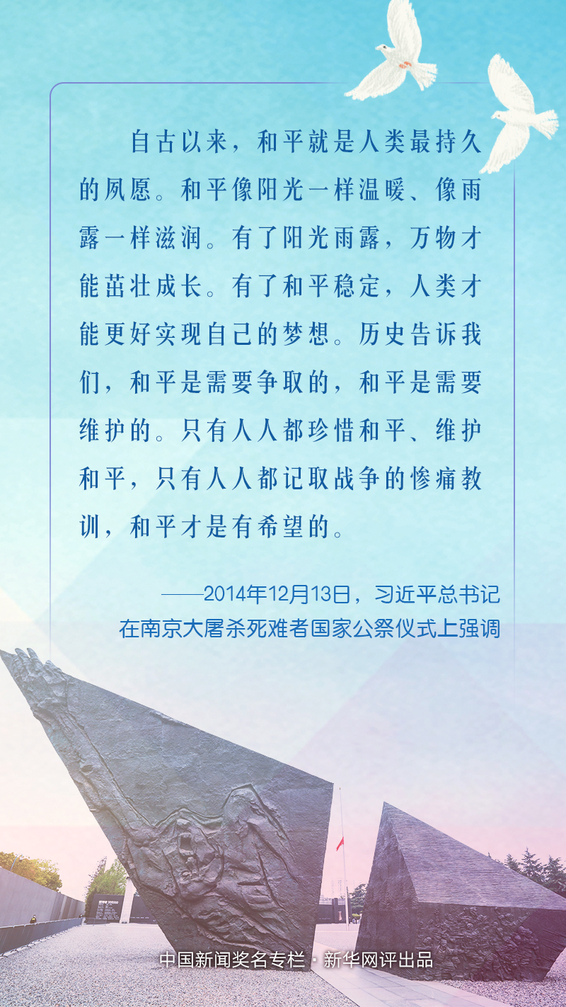 和平是人類的永恒期望。今天,和平與發(fā)展已經(jīng)成為時(shí)代主題,但世界仍很不太平,戰(zhàn)爭(zhēng)的達(dá)摩克利斯之劍依然懸在人類頭上。歷史告訴我們,和平需要爭(zhēng)取,更需要維護(hù)。只有人人都珍惜和平、維護(hù)和平,只有人人都汲取戰(zhàn)爭(zhēng)的慘痛教訓(xùn),和平才會(huì)更有希望。我們要以史為鑒,堅(jiān)定維護(hù)和平的決心,堅(jiān)定不移走和平發(fā)展道路,才能推動(dòng)建設(shè)持久和平、普遍安全、共同繁榮、開(kāi)放包容、清潔美麗的新世界,讓和平的陽(yáng)光永遠(yuǎn)普照人類生活的星球。