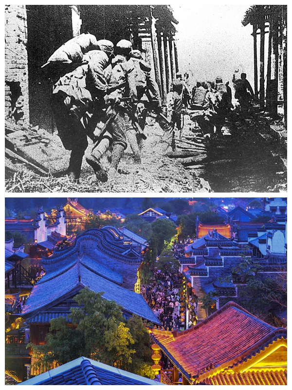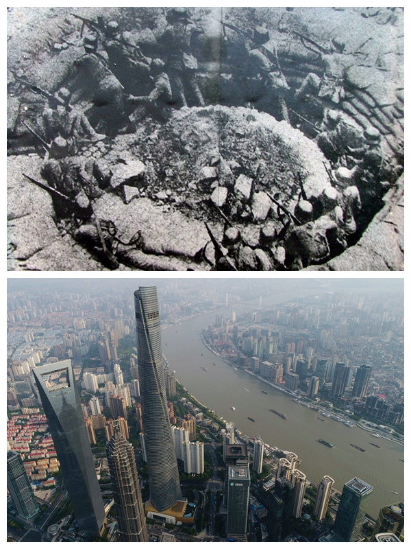 上圖為1937年8月13日至11月12日,中日軍隊(duì)進(jìn)行淞滬會(huì)戰(zhàn),這次會(huì)戰(zhàn)粉碎了日本軍國主義者速戰(zhàn)速?zèng)Q的迷夢(mèng)。這是中國軍隊(duì)88師在上海閘北的環(huán)形工事里同日軍巷戰(zhàn)。