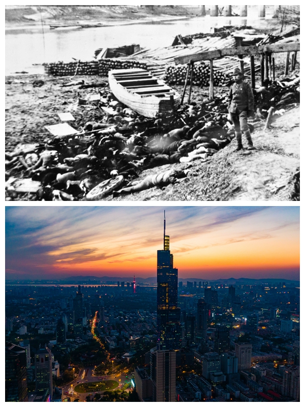 上圖為1937年12月中旬,日本侵略軍攻占中國南京后,對(duì)中國老百姓進(jìn)行了空前的慘無人道的大屠殺。在南京城西一條流往長江的小河邊,被日本侵略軍殺害的中國人,尸體遍地血流成河。