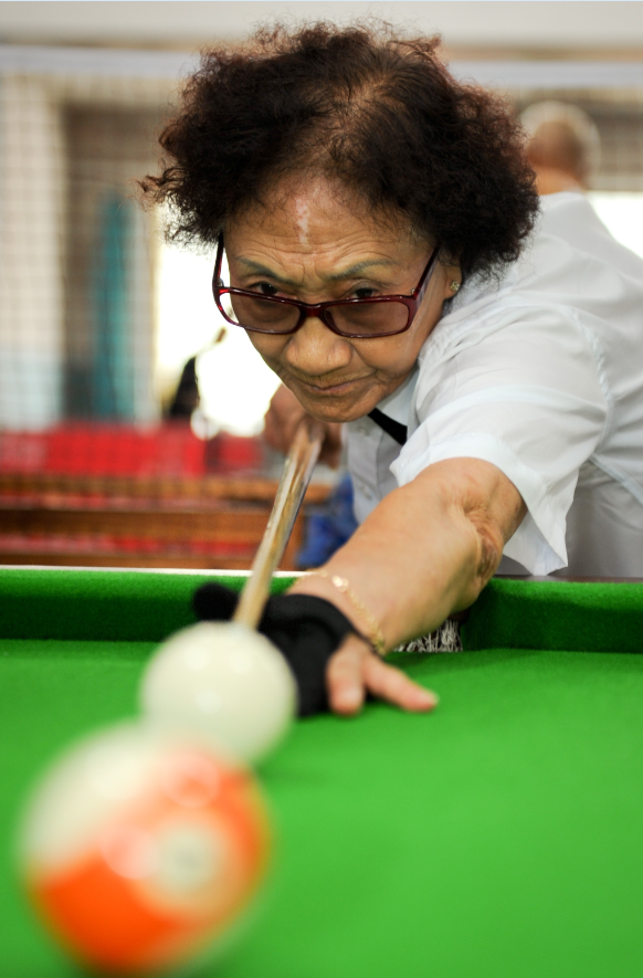 長(zhǎng)春市春城街道活動(dòng)中心老人馮化庚在該中心臺(tái)球培訓(xùn)班做示范