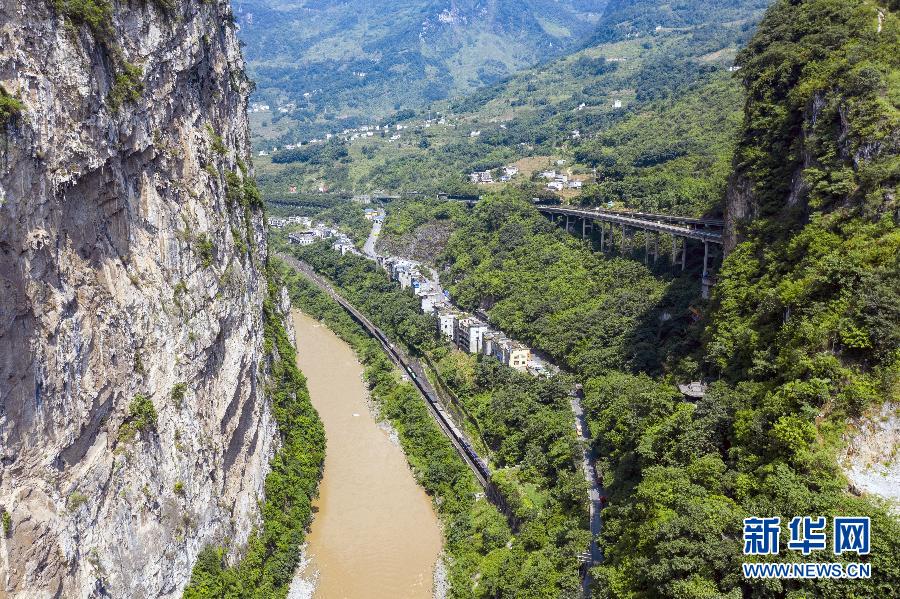 在云南省昭通市鹽津縣豆沙關(guān),五尺道、關(guān)河水道、內(nèi)昆鐵路、G247公路及G85渝昆高速5條不同時期的交通線路以幾乎并行的姿態(tài)呈現(xiàn)眼前(8月10日攝,無人機照片)。 新華社記者 江文耀 攝