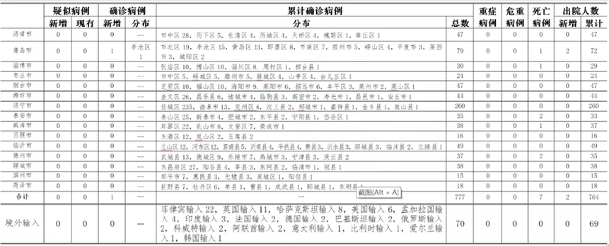 備注:1.山東省本地病例按確診時醫(yī)院所在縣區(qū)統(tǒng)計(jì),境外輸入病例單獨(dú)統(tǒng)計(jì)。
