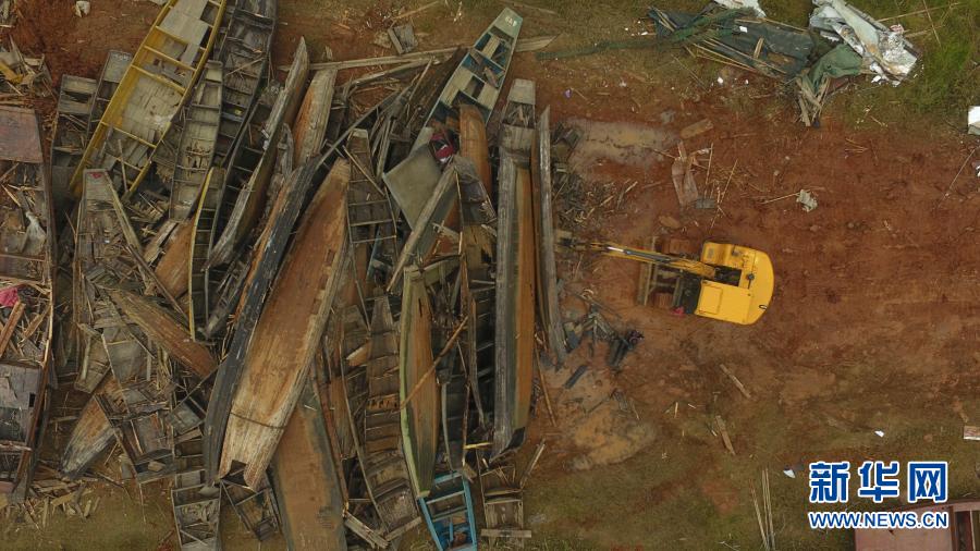 在湖南常德漢壽縣蔣家嘴鎮(zhèn),工作人員在洞庭湖邊駕駛挖掘機(jī)拆解漁民上交的漁船(2019年12月17日攝,無(wú)人機(jī)照片)。新華社記者 薛宇舸 攝