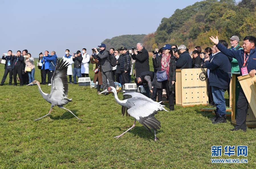 2019年12月8日,國(guó)內(nèi)多家野生動(dòng)物保護(hù)機(jī)構(gòu)在江西鄱陽(yáng)湖國(guó)家級(jí)自然保護(hù)區(qū)將120只被救治的珍稀候鳥(niǎo)成功放飛。這是工作人員放飛兩只白枕鶴。新華社記者 萬(wàn)象 攝