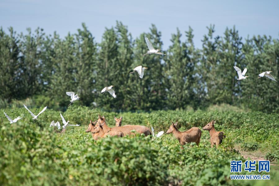 在位于湖南岳陽(yáng)市的東洞庭湖麋鹿和鳥(niǎo)類救治避難中心拍攝的麋鹿和飛鳥(niǎo)(8月7日攝)。新華社記者 陳思汗 攝