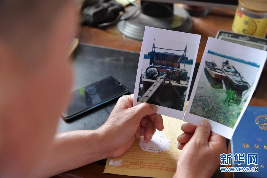 在江西省南昌市新建區(qū)象山鎮(zhèn),上岸漁民吳華山在展示自己珍藏的兩張漁船的照片。這兩條船是吳華山還在當(dāng)漁民時(shí)使用的捕撈船只,上岸轉(zhuǎn)業(yè)之后,船只上交,他用領(lǐng)到的補(bǔ)貼開(kāi)始承包魚塘養(yǎng)殖小龍蝦(6月5日攝)。新華社記者 彭昭之 攝