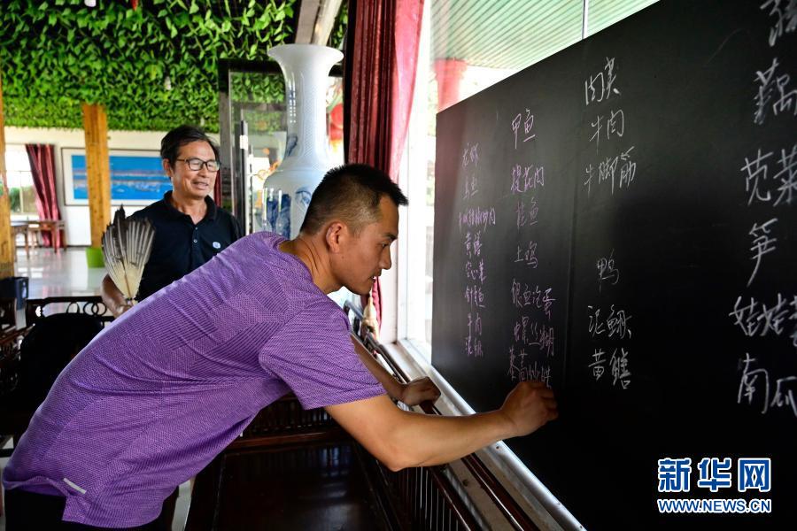 在江西省余干縣田園鄱陽(yáng)湖景區(qū),上岸漁民朱義才(后)在自己開(kāi)辦的農(nóng)家樂(lè)內(nèi)和兒子一起寫當(dāng)日的菜譜(6月16日攝)。新華社記者 彭昭之 攝