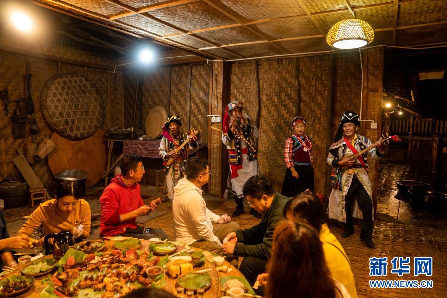 在怒江州福貢縣匹河怒族鄉(xiāng)老姆登村,怒族群眾郁五林(后排右三)在自家開的農(nóng)家樂給客人表演民族歌舞(11月2日攝)。新華社記者 胡超 攝