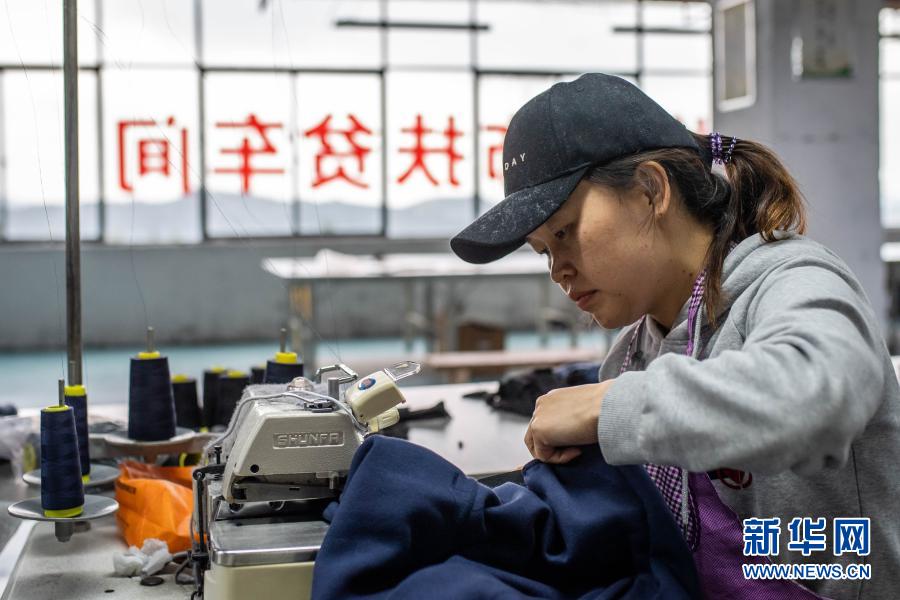 9月24日,搬遷戶龍先燕在鎮(zhèn)雄縣大地易地扶貧搬遷安置點銳烽服飾扶貧車間工作。新華社記者 胡超 攝