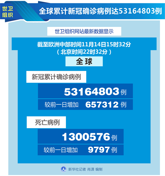 世衛(wèi)組織網(wǎng)站最新數(shù)據(jù)顯示,截至歐洲中部時間14日15時32分(北京時間22時32分),全球確診病例較前一日增加657312例,達(dá)到53164803例;死亡病例增加9797例,達(dá)到1300576例。
