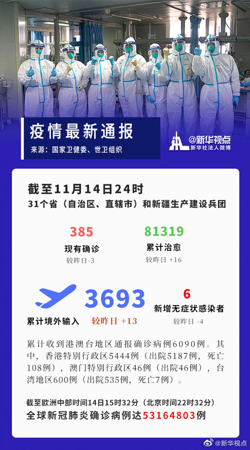 截至11月14日24時(shí),據(jù)31個(gè)省(自治區(qū)、直轄市)和新疆生產(chǎn)建設(shè)兵團(tuán)報(bào)告,現(xiàn)有確診病例385例(其中重癥病例4例),累計(jì)治愈出院病例81319例,累計(jì)死亡病例4634例,累計(jì)報(bào)告確診病例86338例,現(xiàn)有疑似病例2例。累計(jì)追蹤到密切接觸者873191人,尚在醫(yī)學(xué)觀察的密切接觸者15032人。