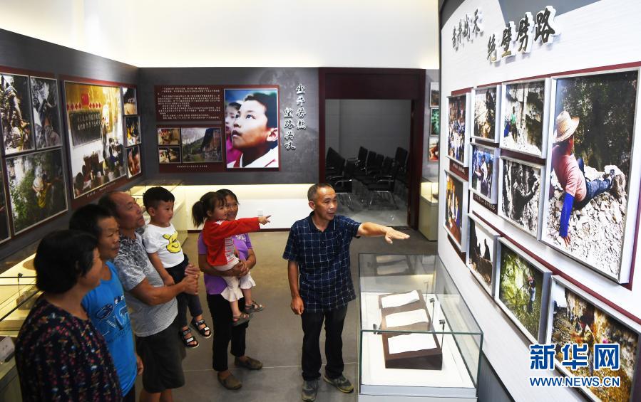 毛相林(右一)在下莊精神陳列館內(nèi)講述當(dāng)年修路的故事(2020年7月3日攝)。