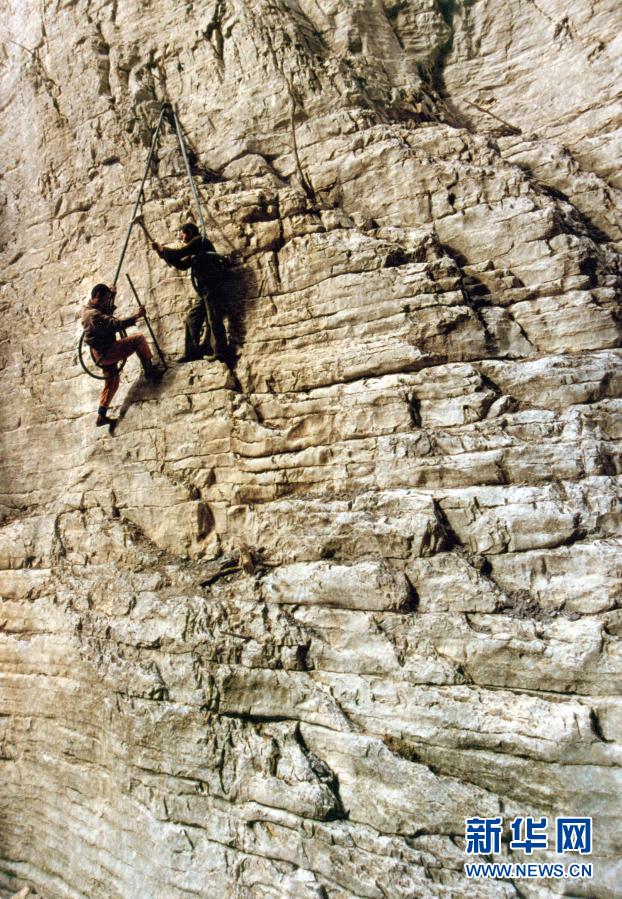 修路遠(yuǎn)比想象的難。四周陡峭巖壁,很難找到落腳之地,膽子大的腰系長繩站在籮筐里,吊在幾百米高的懸崖邊鉆炮眼,先炸出一小塊立足之地,再用鋤頭、鋼釬和大錘,一塊一塊把石頭鑿下來。