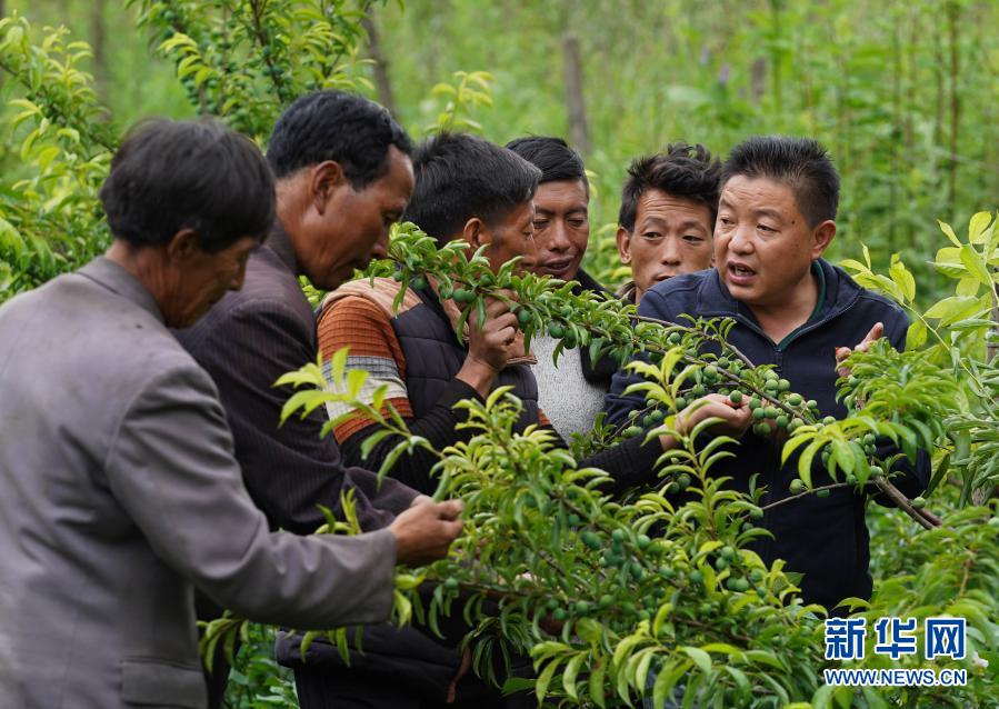 派駐到布拖縣覺撒鄉(xiāng)的幫扶干部楊永林(右一)在博作村帶領村民查看茵紅李掛果情況(6月22日攝)。新華社記者 江宏景 攝