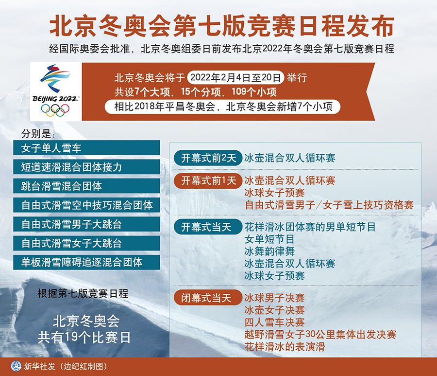 北京冬奧會(huì)將于2022年2月4日至20日舉行,共設(shè)7個(gè)大項(xiàng)、15個(gè)分項(xiàng)、109個(gè)小項(xiàng)。相比2018年平昌冬奧會(huì),北京冬奧會(huì)新增7個(gè)小項(xiàng),分別是:女子單人雪車(chē)、短道速滑混合團(tuán)體接力、跳臺(tái)滑雪混合團(tuán)體、自由式滑雪空中技巧混合團(tuán)體、自由式滑雪男子大跳臺(tái)、自由式滑雪女子大跳臺(tái)和單板滑雪障礙追逐混合團(tuán)體。