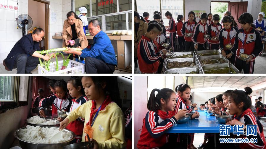 這是一張拼版照片。上左:在融水苗族自治縣東陽村小學(xué),廚房師傅們?cè)跍?zhǔn)備營養(yǎng)午餐;上右:東陽村小學(xué)學(xué)生根據(jù)需要挑選菜肴。下左:東陽村小學(xué)學(xué)生排隊(duì)打飯;下右:東陽村小學(xué)學(xué)生在食用營養(yǎng)午餐。近年來,廣西在貧困地區(qū)大力推行學(xué)生營養(yǎng)餐,幫助貧困學(xué)生健康成長(zhǎng)(2019年5月6日攝)。新華社記者 張愛林 攝