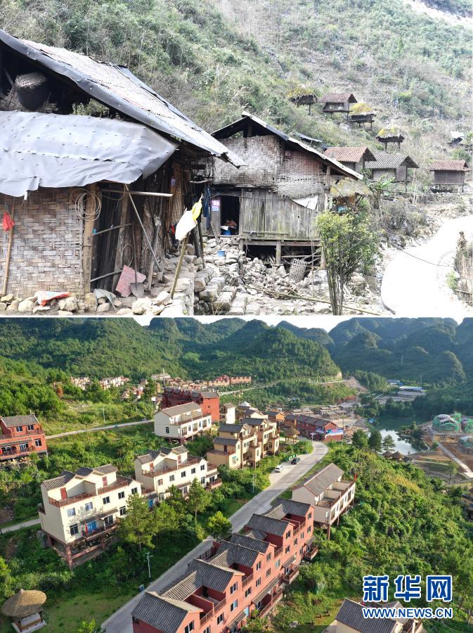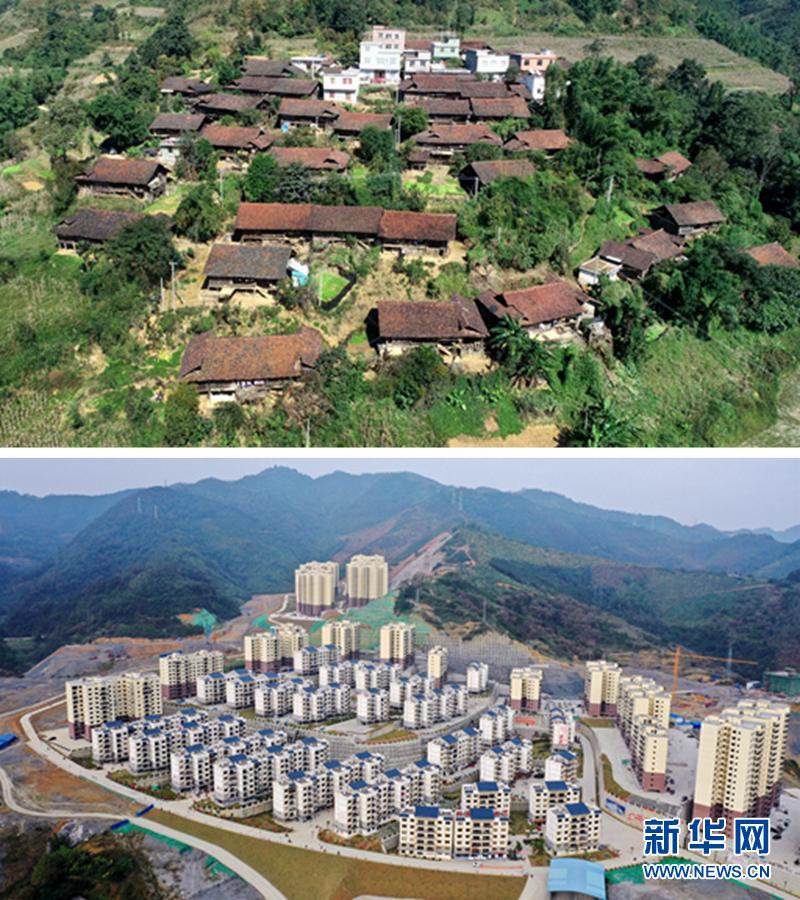 這是一張拼版照片。上圖:廣西百色市隆林各族自治縣金鐘山鄉(xiāng)平流村坡安屯群眾搬遷前的住房(2017年7月21日攝,無人機(jī)照片);下圖:平流村坡安屯群眾搬遷到安置點的新住房(2019年12月3日攝)。新華社記者 張愛林 攝
