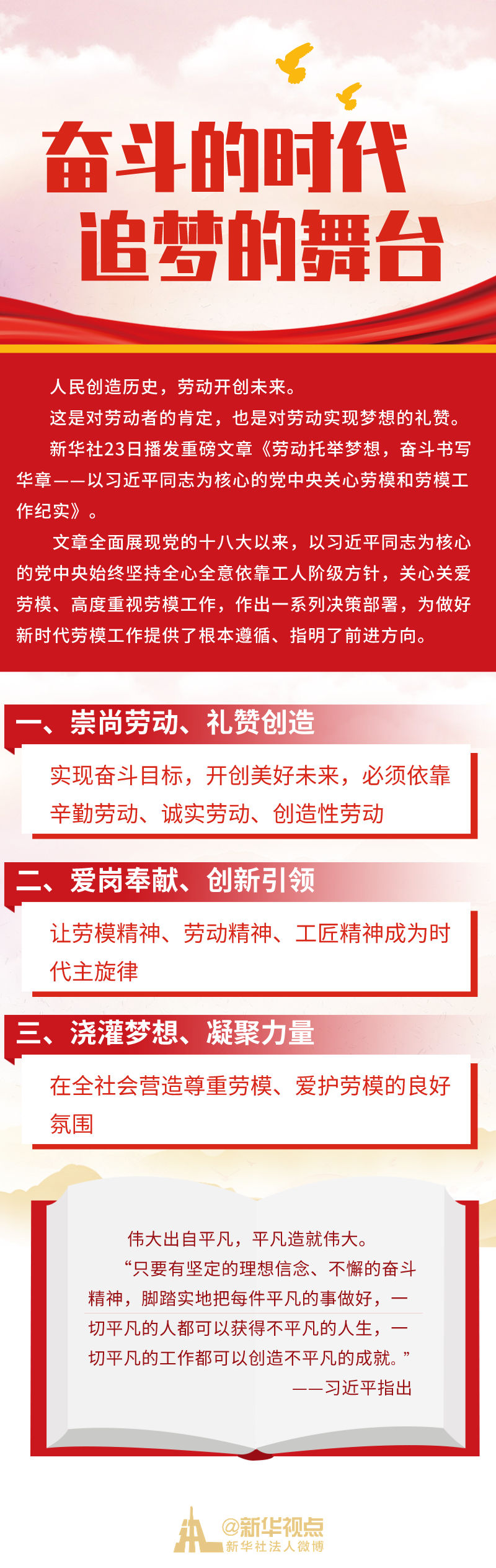 新華社23日播發(fā)重磅文章《勞動(dòng)托舉夢(mèng)想,奮斗書寫華章——以習(xí)近平同志為核心的黨中央關(guān)心勞模和勞模工作紀(jì)實(shí)》。