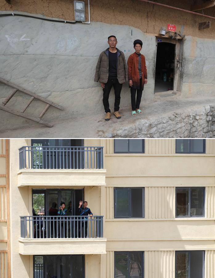 上圖為四川省昭覺縣阿土列爾村村民某色達(dá)體夫婦在“懸崖村”的家門口拍照留念(5月13日攝);下圖為某色達(dá)體夫婦在昭覺縣城易地扶貧搬遷安置點(diǎn)南坪社區(qū)新家的陽臺上揮手(5月13日攝)。新華社記者 江宏景 攝