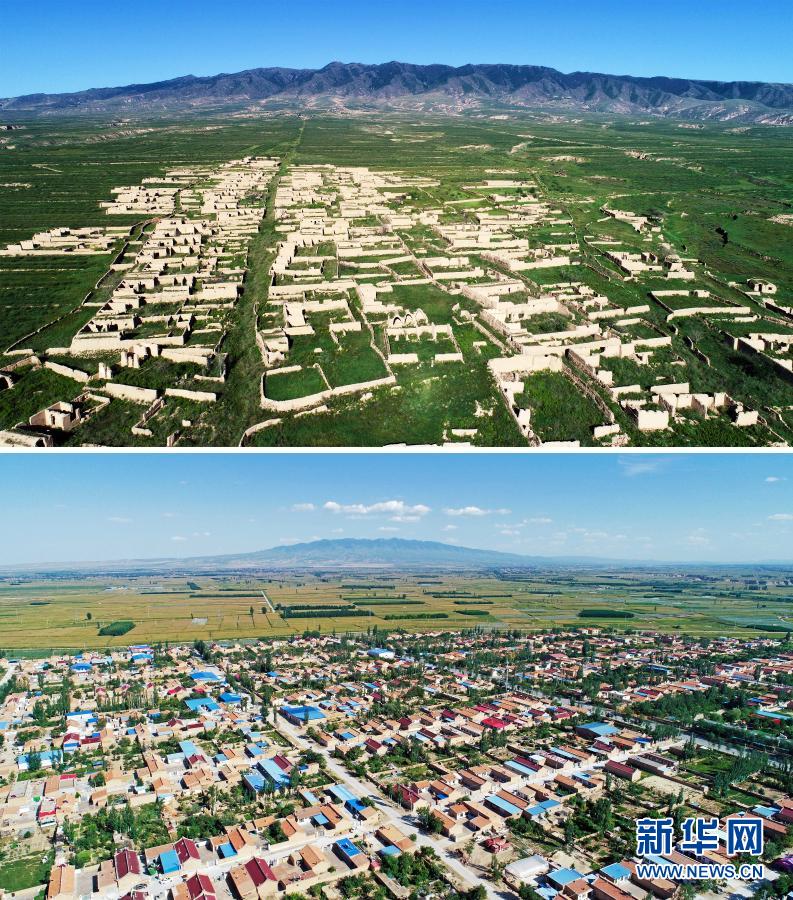 這是一張拼版照片,上圖為:經(jīng)過(guò)多年的生態(tài)修復(fù),寧夏吳忠市紅寺堡區(qū)新莊集鄉(xiāng)的移民舊址已逐漸被綠色覆蓋;下圖為:戈壁荒灘上建起的紅寺堡移民新村(2018年9月8日攝,無(wú)人機(jī)照片)。新華社記者 王鵬 攝