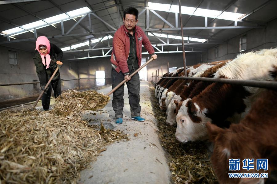 寧夏吳忠市同心縣河西鎮(zhèn)旱天嶺村村民馬國(guó)才(右)、馬婷夫婦在村里的養(yǎng)牛合作社喂牛(2017年12月21日攝)。新華社記者 王鵬 攝