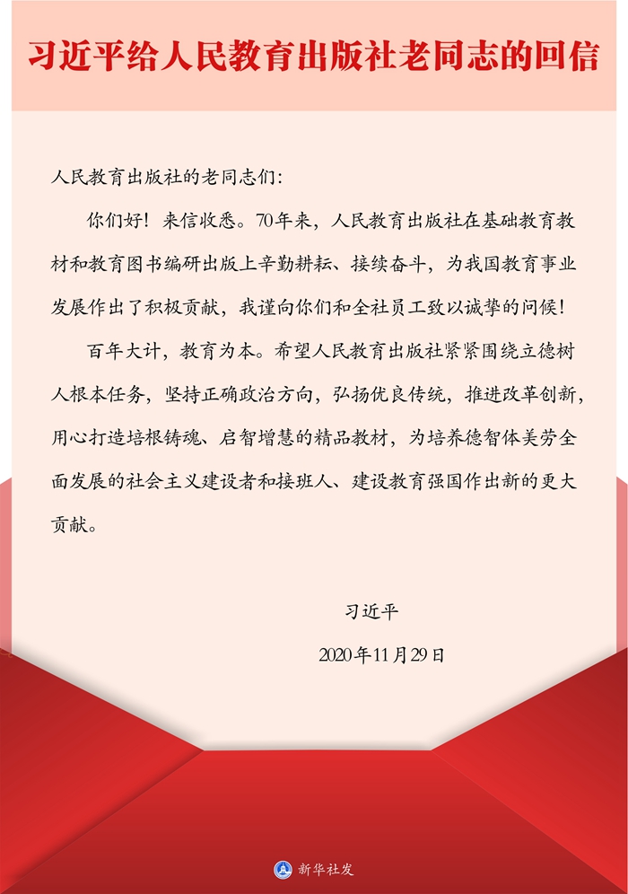 習(xí)近平給人民教育出版社老同志回信強調(diào) 緊緊圍繞立德樹人根本任務(wù) 用心打造培根鑄魂啟智增慧的精品教材