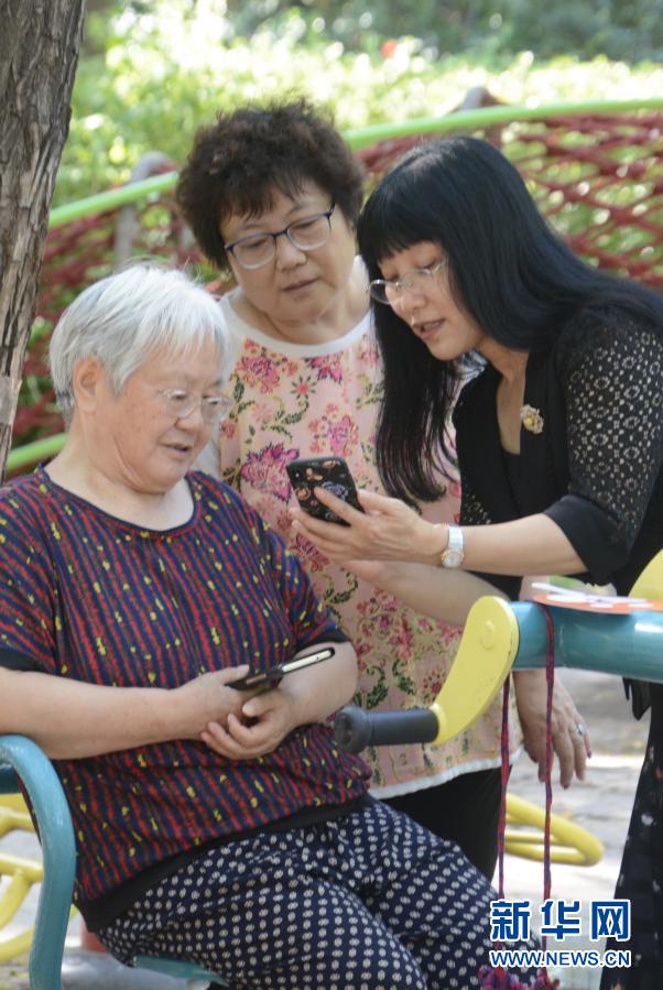 龍澤苑社區(qū)黨支部書記、居委會主任伊然(右)在社區(qū)內(nèi)教老年人使用手機里的社區(qū)服務軟件(8月10日攝)。新華社記者 李欣 攝
