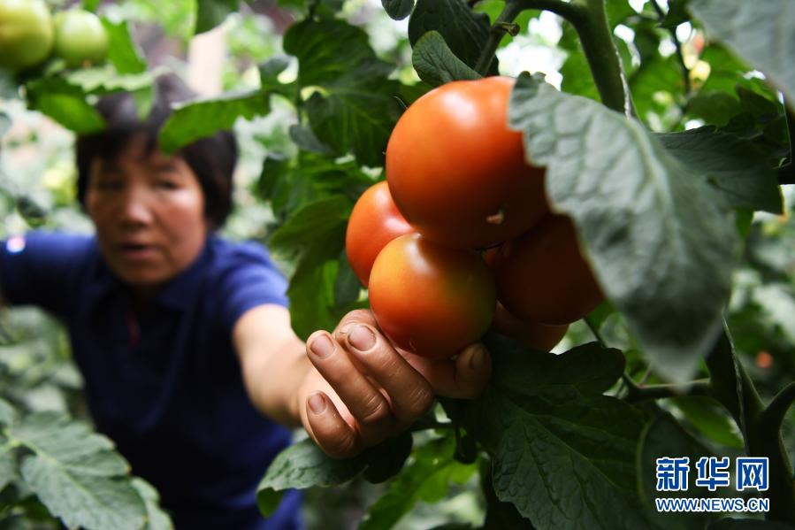 在臨夏回族自治州臨夏縣先鋒鄉(xiāng)前韓村,易地扶貧搬遷戶韓貴蘭在日光溫室內(nèi)采摘西紅柿(8月11日攝)。新華社記者 陳斌 攝