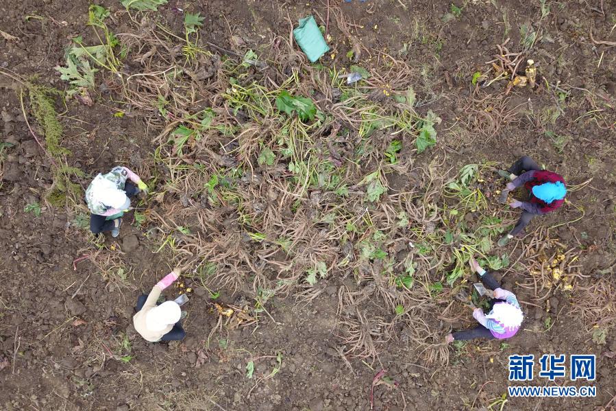 在宕昌縣拉路梁中藥材標(biāo)準(zhǔn)化種植示范基地,村民收獲藥材(9月18日攝,無人機(jī)照片)。新華社記者 范培珅 攝