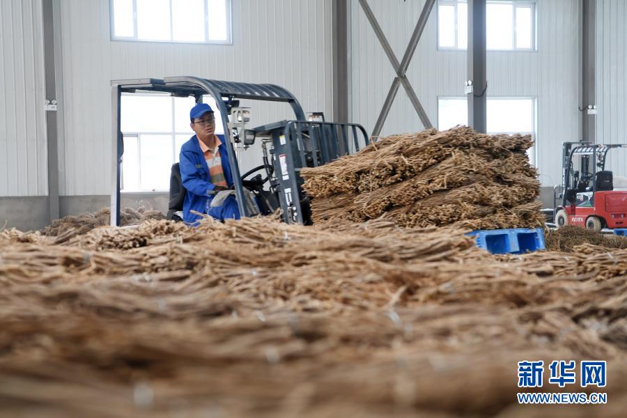 在宕昌縣哈達(dá)鋪琦昆現(xiàn)代中藥材倉儲物流基地,工作人員使用叉車搬運(yùn)中藥材(9月18日攝)。新華社記者 范培珅 攝