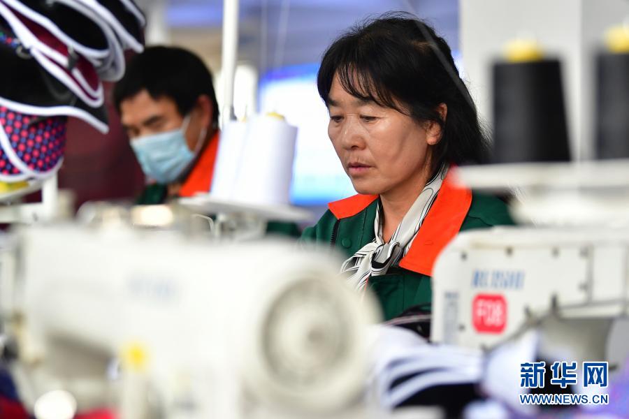在臨夏回族自治州積石山縣,依托東西部扶貧協(xié)作平臺引進(jìn)的服裝加工企業(yè)甘肅拓奇扶貧車間的員工在服裝加工生產(chǎn)線上作業(yè)(8月9日攝)。新華社記者 陳斌 攝