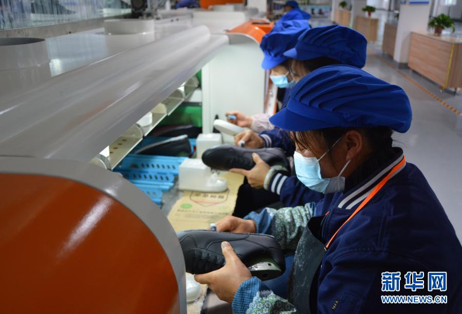 工人在廈琳鞋業(yè)產(chǎn)業(yè)園扶貧車間給成型鞋刷膠(12月1日攝)。新華社記者 顏之宏 攝