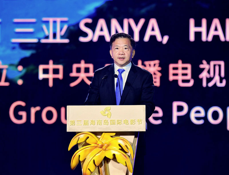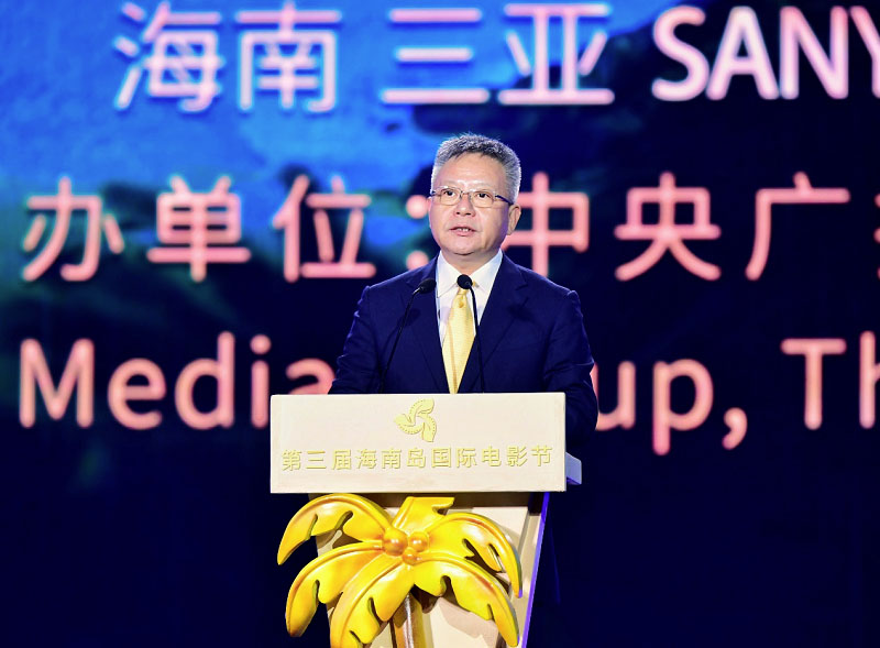 △中宣部副部長(zhǎng)、中央廣播電視總臺(tái)臺(tái)長(zhǎng)、第三屆海南島國(guó)際電影節(jié)組委會(huì)主席慎海雄致辭并宣布開幕