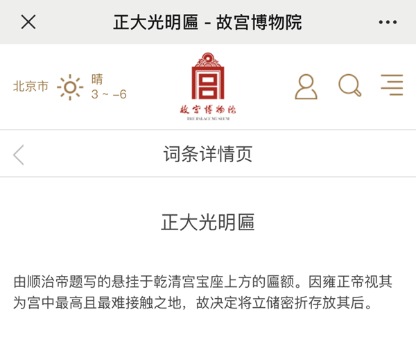 “正大光明”匾由順治帝題寫(xiě),懸掛于乾清宮寶座上方。因雍正帝視其為宮中最高且最難接觸之地,故決定將立儲(chǔ)密折存放其后。