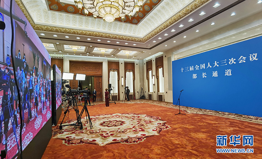 5月22日,十三屆全國人大三次會議開幕會結(jié)束后,首場“部長通道”采訪活動在人民大會堂新聞發(fā)布廳舉行,邀請部分列席會議的國務院有關(guān)部委負責人通過網(wǎng)絡視頻方式接受采訪。圖為“部長通道”現(xiàn)場。新華網(wǎng) 王翰林 攝