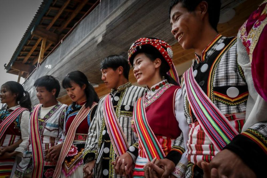 ↑調(diào)研間隙,李金蓮(右二)與村民跳起了傈僳族舞蹈(5月5日攝)。新華社記者 孫敏 攝