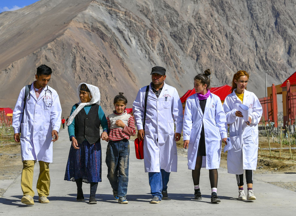 新疆塔什庫爾干塔吉克自治縣達布達爾鄉(xiāng)熱斯喀木村村醫(yī)發(fā)爾亞特·塔西白克(右三)與醫(yī)務人員來到當地易地扶貧搬遷安置點出診(2019年7月7日攝)。新華社記者 胡虎虎 攝