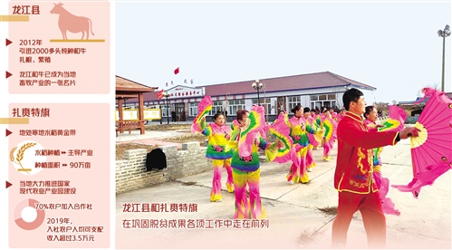 龍江縣是著名的雜糧產區(qū)、畜牧大縣。如今,龍江和牛已成為龍江縣畜牧產業(yè)的一張名片,帶領群眾走上致富路。“我們研究制定了《高檔肉牛優(yōu)勢特色產業(yè)集群建設方案》,從2016年起出臺了扶持政策?!饼埥h委副書記孫立軍告訴記者,當地引導企業(yè)與農戶合作養(yǎng)牛,農戶每購買兩頭母牛,政府會給予一定的補貼款。此外,政府還向企業(yè)采購凍精幫助農戶繁育小牛,小牛犢生長到6個月達標后,由企業(yè)統(tǒng)一收購,價格在1.2萬元至1.4萬元不等。