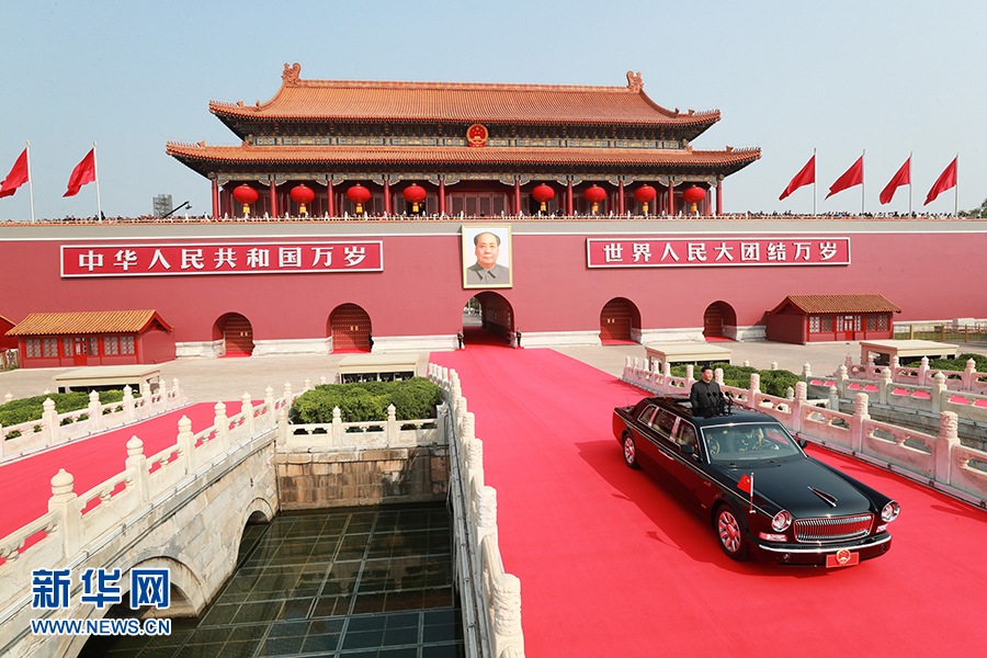 10月1日,慶祝中華人民共和國成立70周年大會(huì)在北京天安門廣場(chǎng)隆重舉行。中共中央總書記、國家主席、中央軍委主席習(xí)近平發(fā)表重要講話并檢閱受閱部隊(duì)。這是習(xí)近平乘坐檢閱車,經(jīng)過金水橋,駛上長安街。 新華社記者 龐興雷 攝