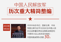 中共中央總書記、國家主席、中央軍委主席習近平3日在紀念中國人民抗日戰(zhàn)爭暨世界反法西斯戰(zhàn)爭勝利70周年大會上的講話中宣布:中國將裁減軍隊員額30萬。