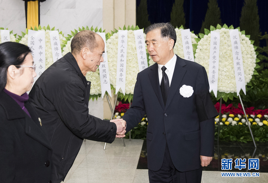 上午9時(shí)許,汪洋等在哀樂聲中緩步來到毛致用同志的遺體前肅立默哀,向毛致用同志的遺體三鞠躬,并與毛致用同志親屬一一握手,轉(zhuǎn)達(dá)習(xí)近平總書記等中央領(lǐng)導(dǎo)同志對(duì)毛致用同志親屬的深切慰問。