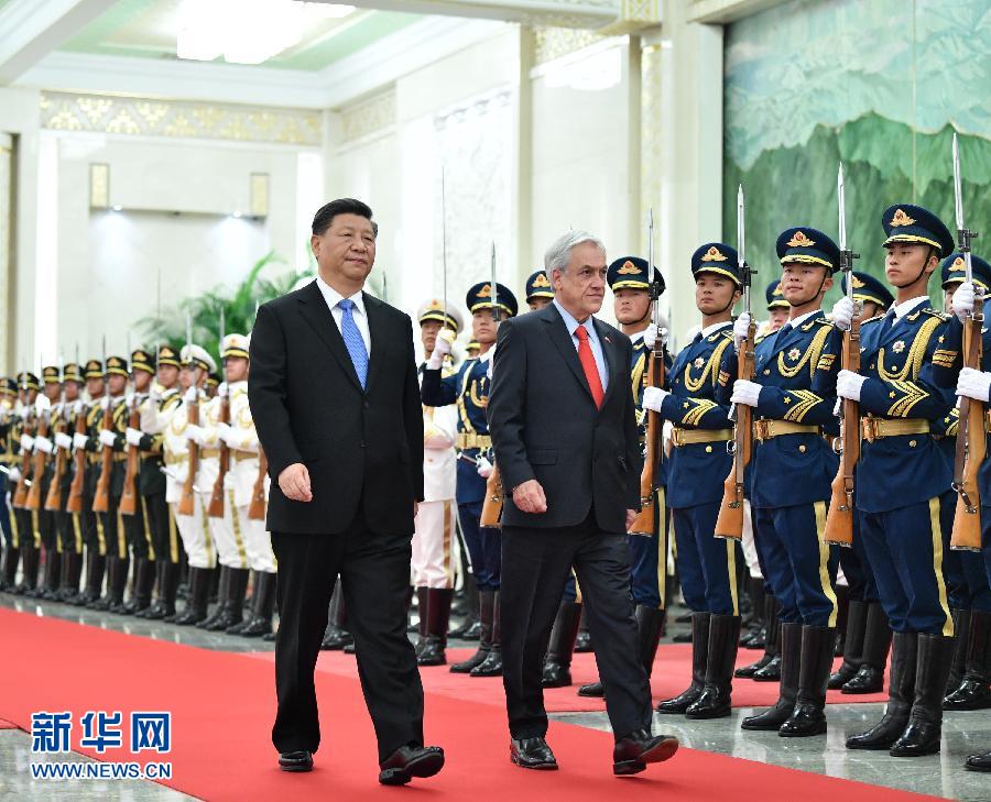 4月24日,國(guó)家主席習(xí)近平在北京人民大會(huì)堂同智利總統(tǒng)皮涅拉舉行會(huì)談。這是會(huì)談前,習(xí)近平在人民大會(huì)堂北大廳為皮涅拉舉行歡迎儀式。 新華社記者 饒愛民 攝