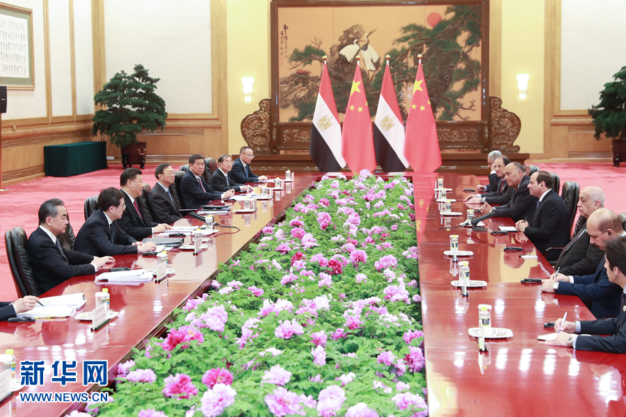 習(xí)近平強(qiáng)調(diào),埃及是非洲聯(lián)盟輪值主席國,總統(tǒng)先生來華出席第二屆“一帶一路”國際合作高峰論壇,不僅體現(xiàn)了埃及積極參與共建“一帶一路”的真誠意愿,也代表著非洲國家尋求互利共贏、實(shí)現(xiàn)共同發(fā)展的普遍呼聲。中方高度重視發(fā)展同埃及關(guān)系。雙方要深化政治互信,繼續(xù)在涉及彼此核心利益和重大關(guān)切問題上相互支持和配合。中方始終支持埃及探索符合本國國情的發(fā)展道路,愿積極參與蘇伊士運(yùn)河走廊開發(fā)計(jì)劃,持續(xù)推進(jìn)蘇伊士經(jīng)貿(mào)合作區(qū)建設(shè)及產(chǎn)能、基礎(chǔ)設(shè)施建設(shè)等領(lǐng)域合作。中方還將在埃及設(shè)立“魯班工坊”,向埃及青年提供職業(yè)技能培訓(xùn)。雙方要深化反恐和安全合作,持續(xù)密切人文交流。中國感謝非洲人民對(duì)中國的信任,我們支持非洲和平安全與可持續(xù)發(fā)展倡議和非洲一體化進(jìn)程,愿同埃方加強(qiáng)對(duì)非三方合作,共同促進(jìn)非洲基礎(chǔ)設(shè)施建設(shè)。