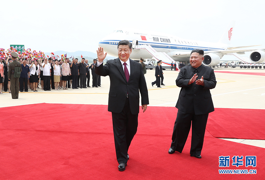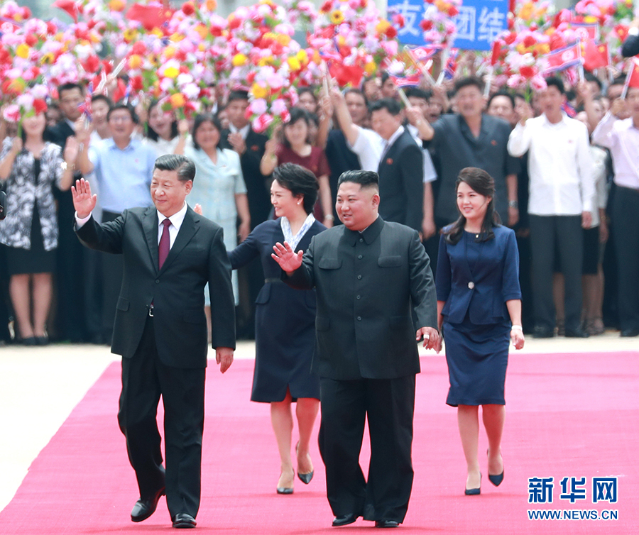 當?shù)貢r間12時許,習(xí)近平乘坐的專機抵達平壤順安機場。雨后初晴的平壤,天高云淡、氣候怡人,到處郁郁蔥蔥、繁花似錦,整個城市洋溢著友好熱烈的氣氛。機場上中朝兩國國旗迎風(fēng)飄揚,“熱烈歡迎中國共產(chǎn)黨中央委員會總書記、中華人民共和國主席習(xí)近平同志”“鮮血凝成的朝中兩國人民之間牢不可破的友誼團結(jié)萬歲”大幅標語高高懸掛,近萬名群眾排列成整齊的隊伍,有力地揮動著花束,以歡快的口號和熱情的笑容,歡迎尊貴的中國客人到來。朝鮮勞動黨委員長、國務(wù)委員會委員長金正恩和夫人李雪主到機場迎接。