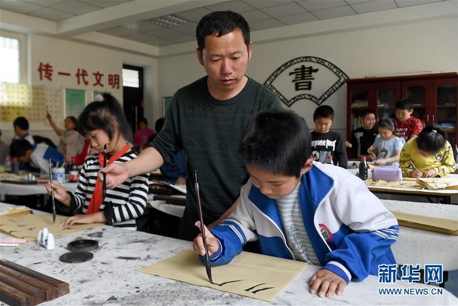 陜西省延安市楊家?guī)X福州希望小學書法社團的學生在老師指導下練習書法(4月24日攝)。新華社記者 劉瀟 攝