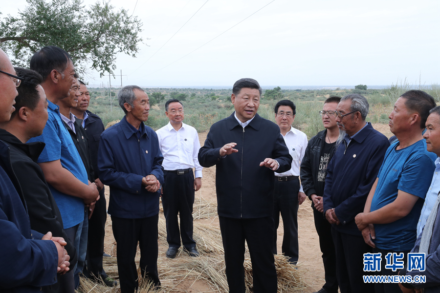 8月19日至22日,中共中央總書記、國家主席、中央軍委主席習(xí)近平在甘肅考察。這是21日上午,習(xí)近平在武威市古浪縣八步沙林場同“六老漢”代表及林場職工親切交談。 新華社記者 鞠鵬 攝