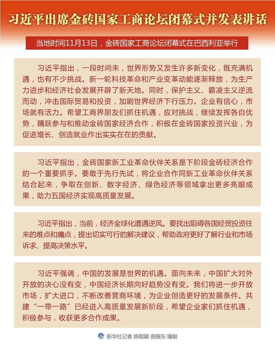當(dāng)?shù)貢r(shí)間11月13日,金磚國(guó)家工商論壇閉幕式在巴西利亞舉行。國(guó)家主席習(xí)近平出席并發(fā)表講話(huà)。 新華社記者 丁海濤 攝