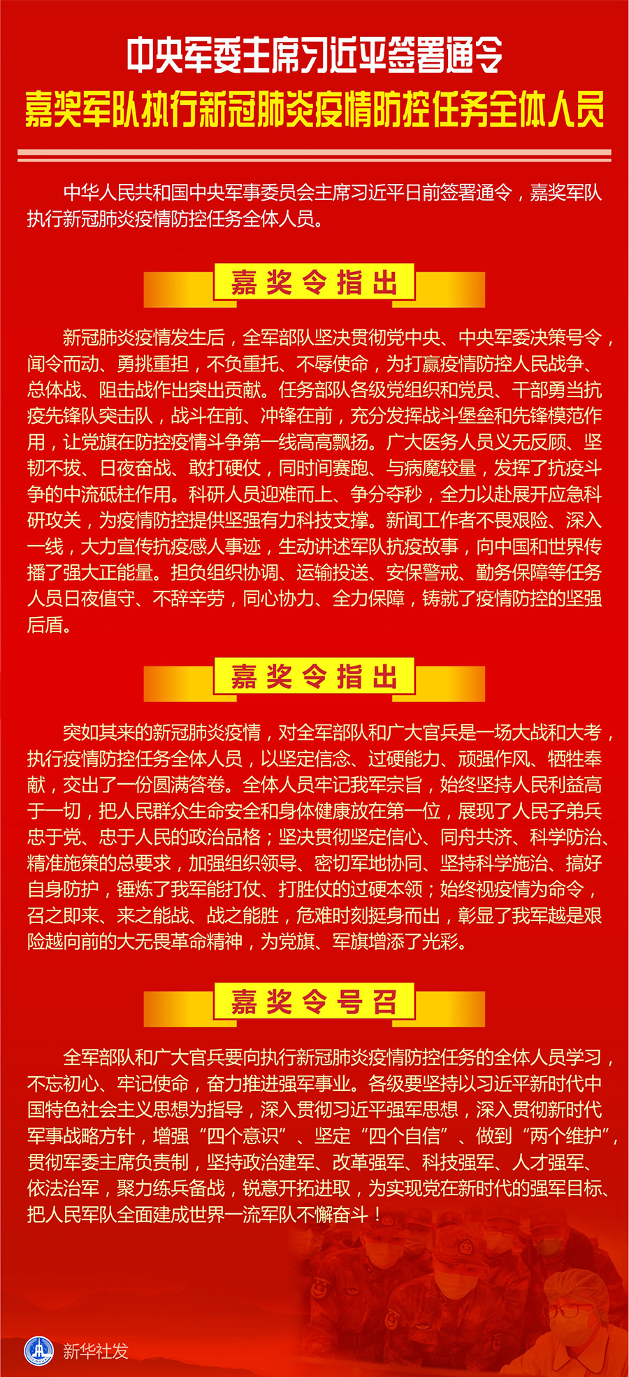 嘉獎令指出,突如其來的新冠肺炎疫情,對全軍部隊(duì)和廣大官兵是一場大戰(zhàn)和大考,執(zhí)行疫情防控任務(wù)全體人員,以堅(jiān)定信念、過硬能力、頑強(qiáng)作風(fēng)、犧牲奉獻(xiàn),交出了一份圓滿答卷。全體人員牢記我軍宗旨,始終堅(jiān)持人民利益高于一切,把人民群眾生命安全和身體健康放在第一位,展現(xiàn)了人民子弟兵忠于黨、忠于人民的政治品格;堅(jiān)決貫徹堅(jiān)定信心、同舟共濟(jì)、科學(xué)防治、精準(zhǔn)施策的總要求,加強(qiáng)組織領(lǐng)導(dǎo)、密切軍地協(xié)同、堅(jiān)持科學(xué)施治、搞好自身防護(hù),錘煉了我軍能打仗、打勝仗的過硬本領(lǐng);始終視疫情為命令,召之即來、來之能戰(zhàn)、戰(zhàn)之能勝,危難時(shí)刻挺身而出,彰顯了我軍越是艱險(xiǎn)越向前的大無畏革命精神,為黨旗、軍旗增添了光彩。