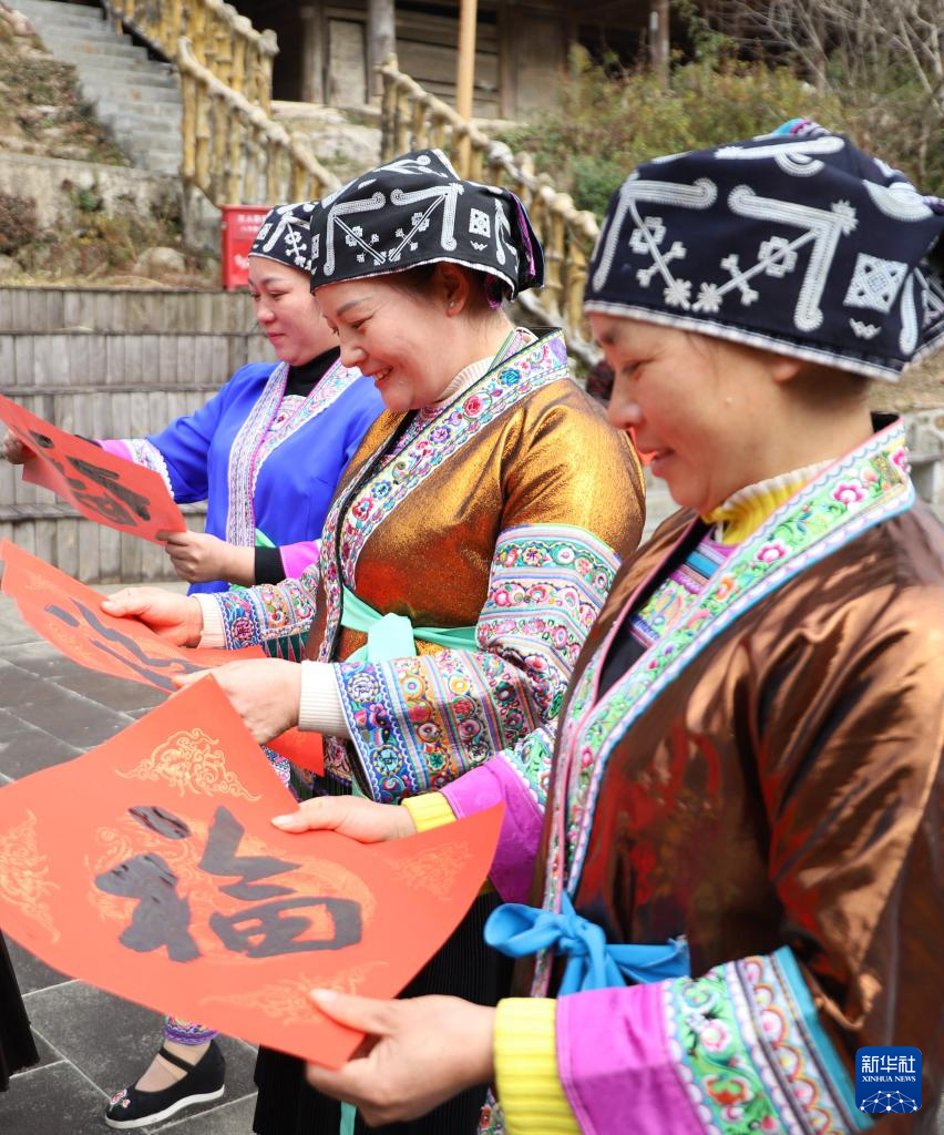 1月20日,在广西柳州市融水苗族自治县四荣乡荣地村大屯侗寨,村民在送春联活动中领取福字。