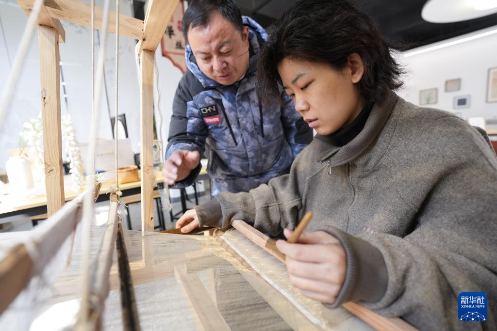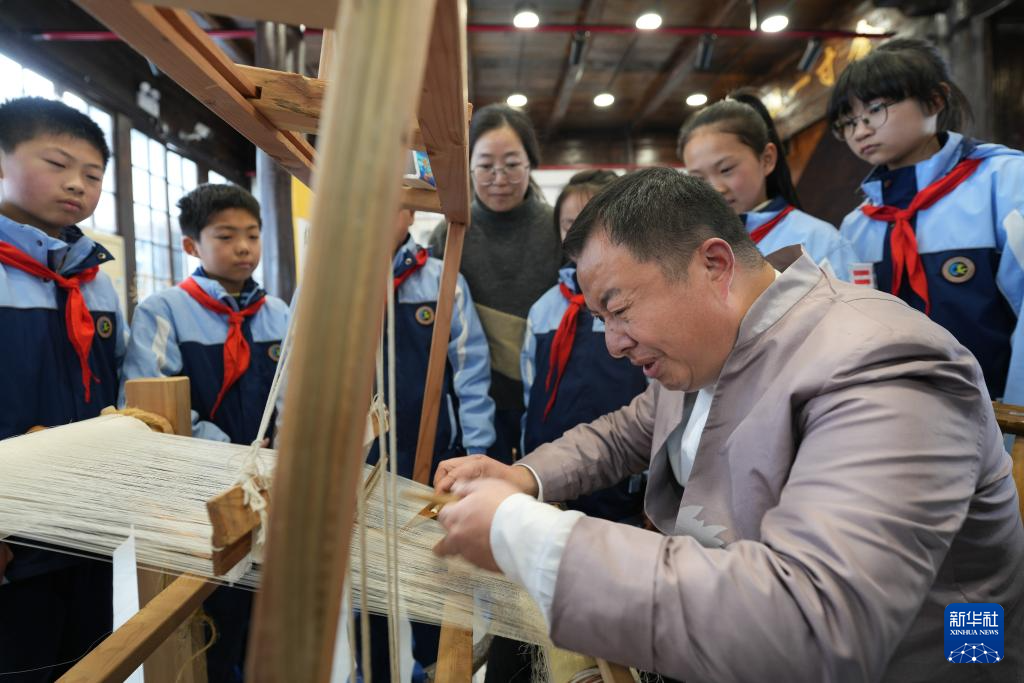 2月19日,柯翔祥(左)在德清莫干山镇由蚕种场改造的丝绸技艺展示馆给从西安前来研学的大学生介绍缂丝技术。